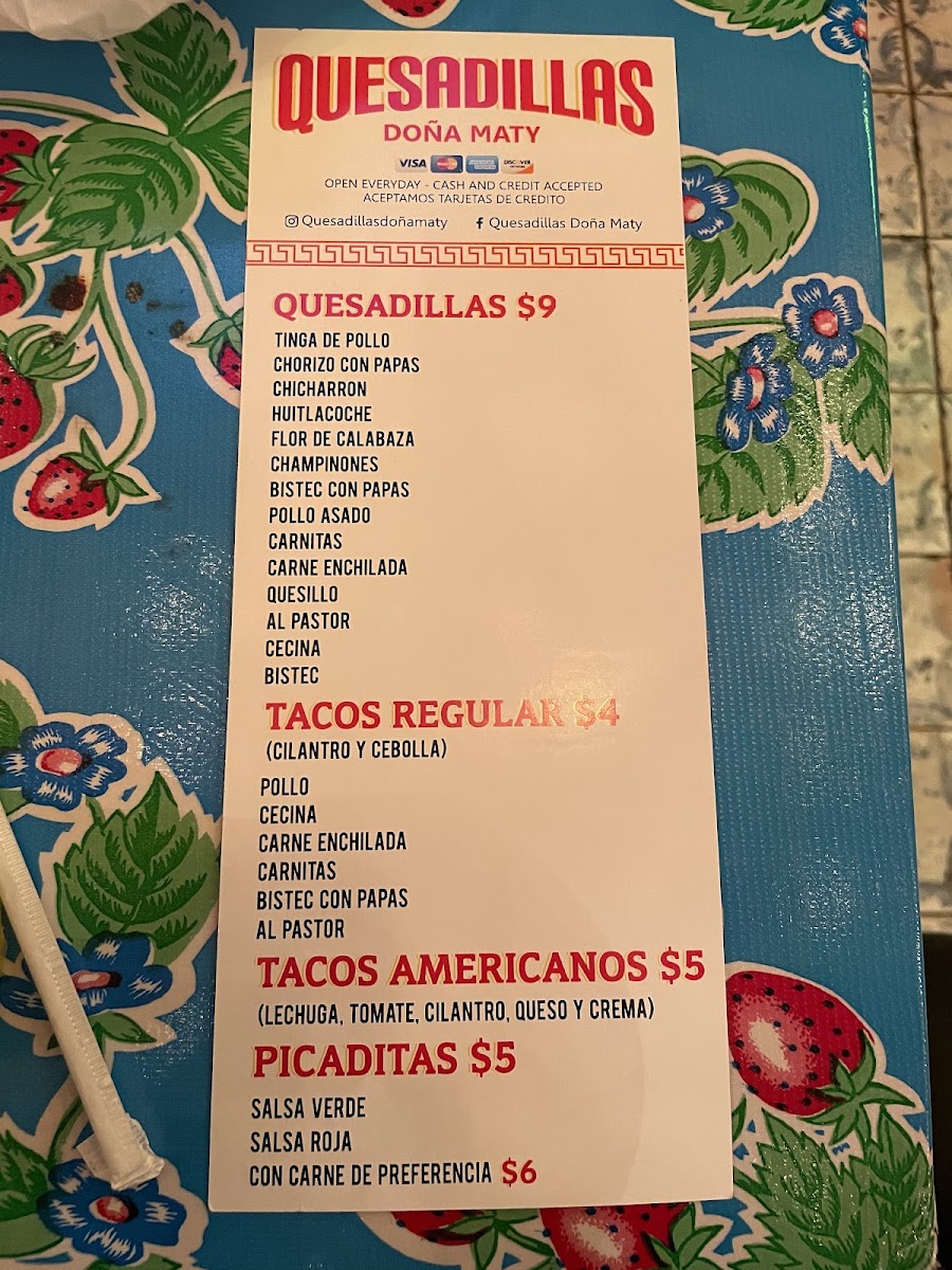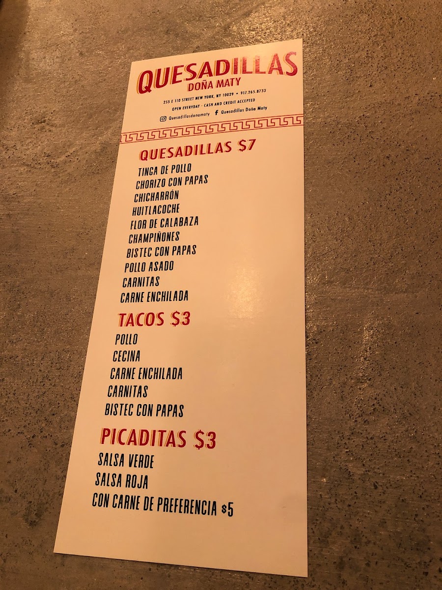 The Quesadillas Doña Maty 2 Menu offers a vibrant selection of traditional Mexican favorites, bringing rich flavors to every dish. Located at 255 E 110th St, New York, NY, this cozy spot is a local favorite for those craving delicious, freshly made quesadillas. Whether you prefer a classic cheese-filled quesadilla or a more adventurous option with hearty fillings like chicken, beef, or veggies, there’s something to satisfy every taste.